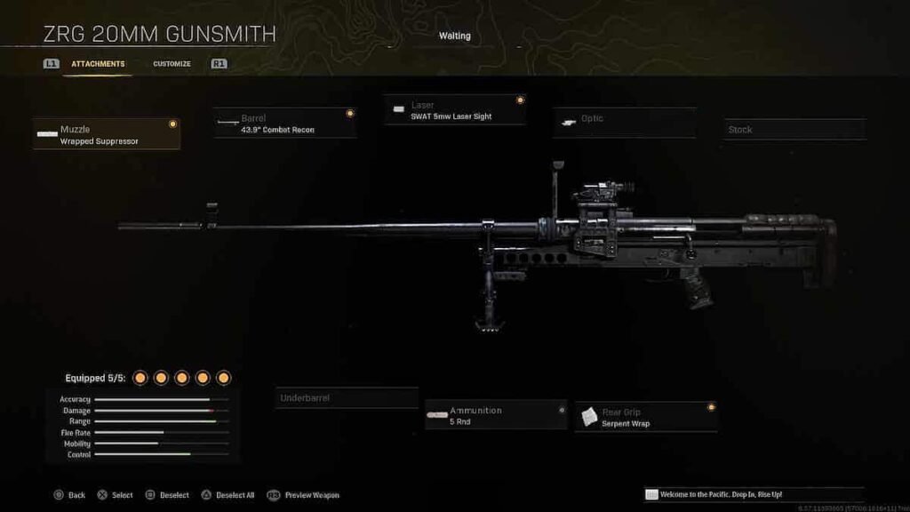 Começaremos este carregamento com o cano do supressor Wrapped e o cano Combat Recon de 43,9 ″ para melhorar o alcance de dano e a velocidade da bala do ZRG 20mm Sniper Rifle.