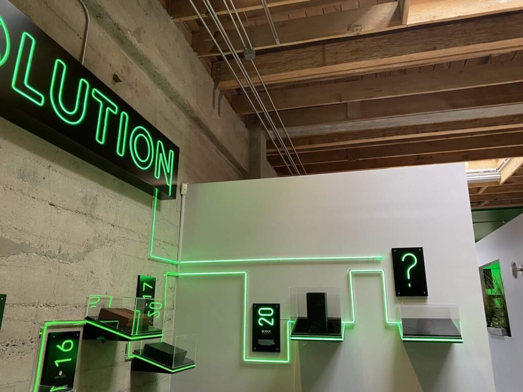 Em seu estande, a empresa colocou lado a lado os seus principais consoles à mostra, cada um marcado com o ano em que foi lançado. No entanto, ao final do estande, temos um espaço vazio com a placa do ano simplesmente dizendo “?”.